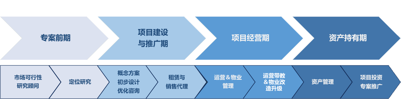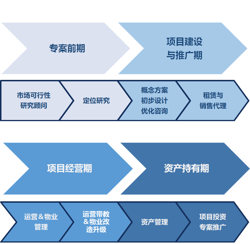 除了能为客户提供前期策划外,还具有丰富的全程服务经验,能在招商、运营管理、投资顾问等领域为客户提供全面的服务,可在项目各阶段提供专业服务,为客户提供一站式全程服务,确保项目质量落地。